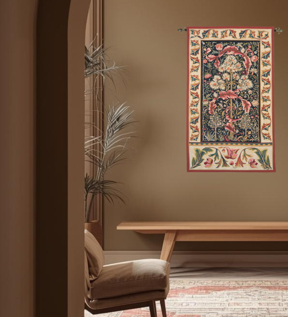 This beautiful tapestry is woven on a jacquard loom by skilled weavers, keeping alive the centuries old tradition of tapestry manufacturing from generation to generation. This tapestry is fully lined incorporating a rod pocket on the back for hanging with an exclusive Heirloom flush-to-wall hanging rod. Alternatively, this tapestry can be hung with a decorative pole of your choice.