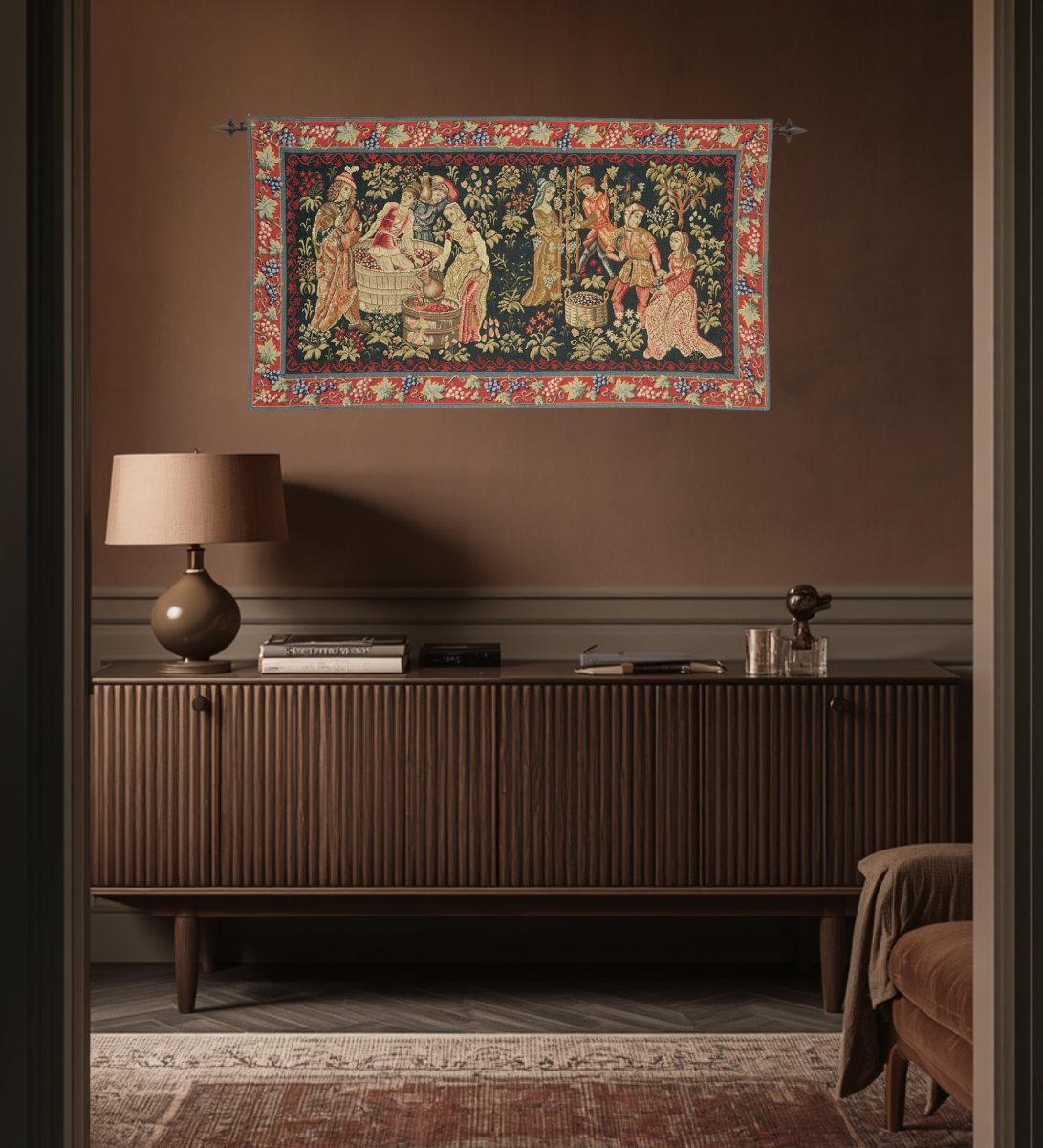 In the Middle Ages, tapestries were almost exclusively commissioned by the nobility, yet they often featured scenes from everyday life including peasant activities. This tapestry depicts the harvesting of grapes on the right, and the treading of them into wine on the left. The story is set against a mille-fleurs (thousand flowers) background which was very popular in the 15th Century and was possibly inspired by the custom of strewing cut flowers on the ground on fte days.